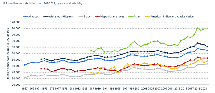 Figura 2: Disparità Salariali Razziali dal 1967 al 2022. Fonte: US Census Bureau, 2022