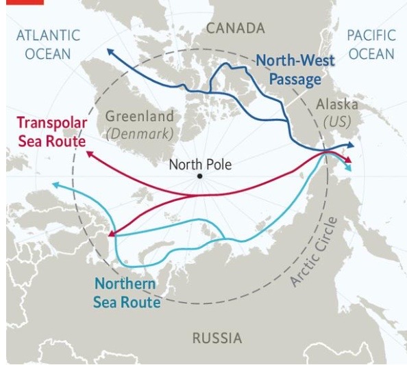 naturale (1,36 trilioni di metri cubi). Le risorse rientrano a pieno titolo nella strategia economica di Trump, come dimostra lo slogan Drill baby drill, con cui ha promesso di avviare nuove trivellazioni in Alaska. Tuttavia, sulle due sopracitate nazioni probabilmente aleggia un altro, fondamentale interesse strategico: il Mar glaciale Artico. Lo scioglimento dei ghiacciai nella zona del polo nord renderà infatti possibile aprire nuove rotte marittime, in grado di collegare i porti americani, russi e cinesi a quelli europei in tempi significativamente più brevi e convenienti. Se ciò effettivamente avvenisse, nascerebbero con ogni probabilità importanti hub portuali nelle sponde settentrionali del Canada o della Groenlandia. Anche in questo caso, dunque, l’interesse americano sarebbe quello di contrastare l’espansione commerciale cinese, ulteriormente accentuata a seguito della creazione delle tre macro-rotte della Nuova Via della Seta (una delle quali, non a caso, passa proprio per l’Artico, partendo dai porti di Dalian e Vladivostok, toccando il Porto di Sabetta in Siberia e chiudendosi in quello di Rotterdam, in Europa).