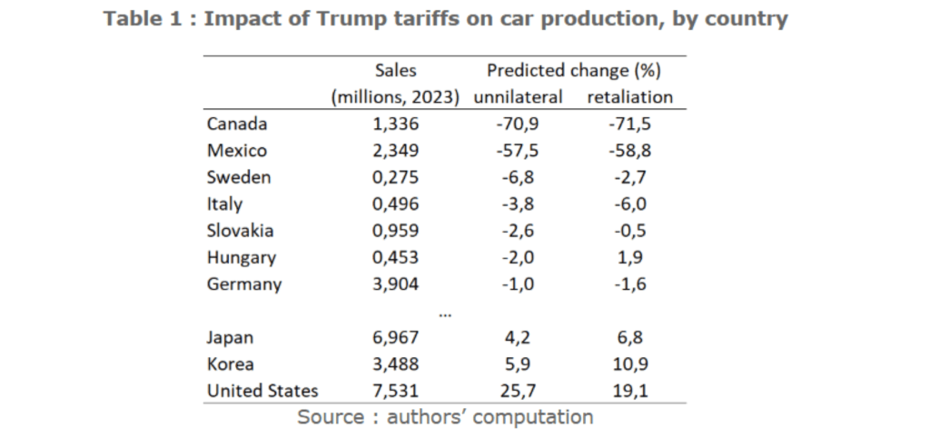 Guardando al resto del mondo, non tutti sarebbero colpiti allo stesso modo. Una simulazione sui flussi commerciali del 2023 prevede un crollo della produzione automobilistica in Canada (- 71%) e Messico (-57%), con un primo e significativo impatto sulle case automobilistiche americane, che per decenni hanno prodotto veicoli o componenti in questi paesi. Basti pensare che solo il 54% dei veicoli venduti negli Stati Uniti è prodotto in loco, mentre oltre il 20% proviene proprio da Canada e Messico.