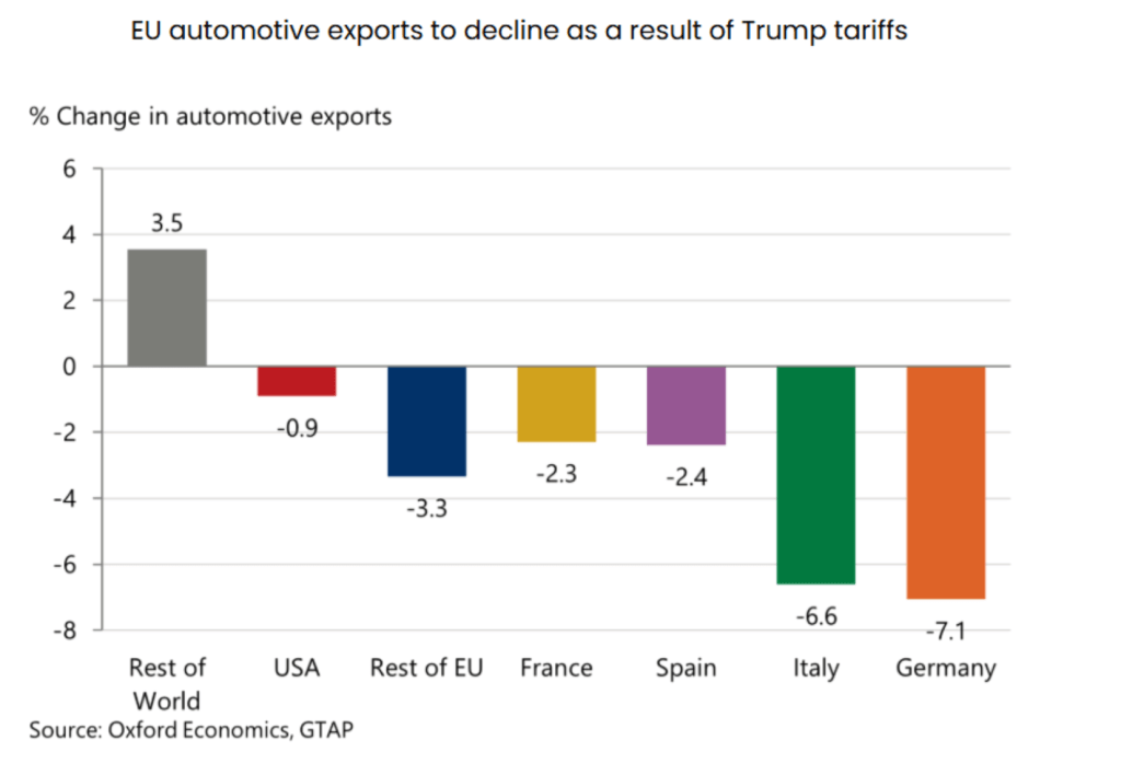 L’industria europea rischia grosso. Nel 2023, le esportazioni di veicoli e componenti verso gli USA valevano 56 miliardi di euro, il 20% dell’export automobilistico dell’UE. Se Washington introducesse dazi del 25% sulle importazioni europee, la competitività dei produttori del Vecchio Continente ne uscirebbe gravemente compromessa. Le auto tedesche e italiane potrebbero perdere tra il 6,6% e il 7,1% delle vendite statunitensi, con impatti minori per Spagna e Francia. La situazione è ulteriormente aggravata dalla minaccia di dazi al 25% per i beni europei: “I consumatori non saranno in grado di assorbire l’aumento dei prezzi e i volumi di vendita diminuiranno. Il settore è già in una posizione fragile e questa enorme incertezza ha già rallentato le transazioni, gli investimenti e l’allocazione di capitale” ha commentato un dirigente di un grande fornitore europeo di componenti automobilistiche.